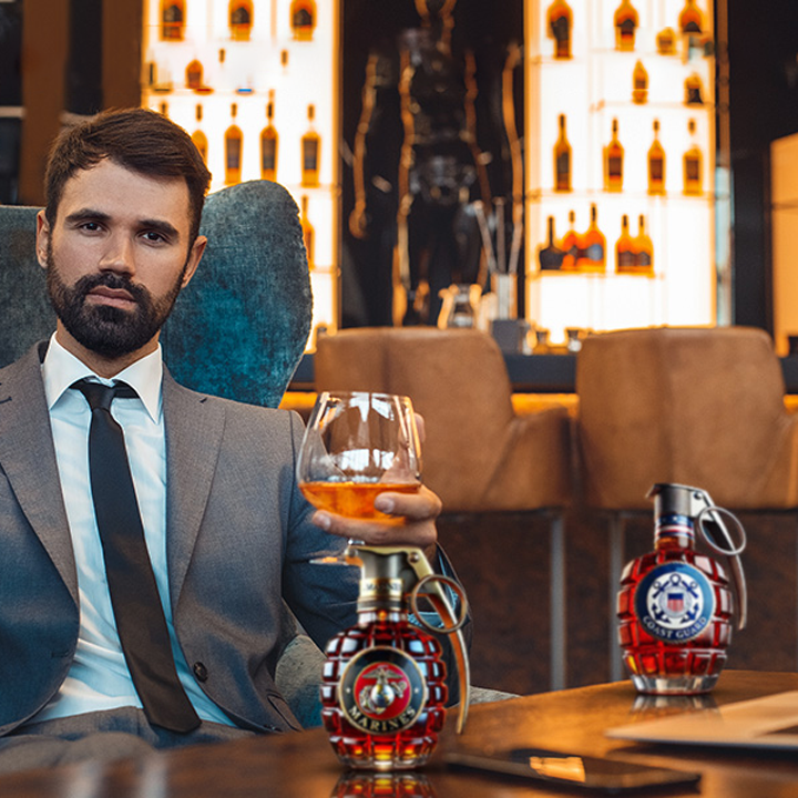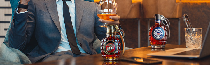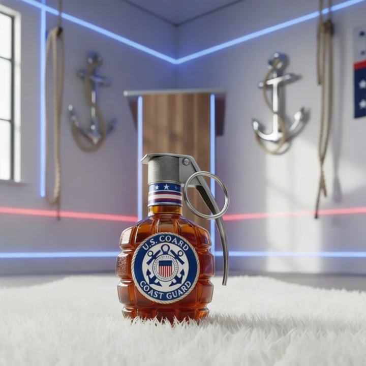 The whiskey bottle features a striking, realistic hand grenade shape, combining rugged aesthetics with exceptional functionality, making it a standout piece for any military-themed collection or display.